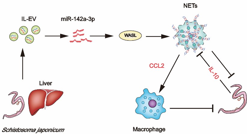 該研究采用小鼠模型,從宿主細胞外囊泡的角度,發現日本血吸蟲感染后,小鼠肝組織來源的胞外囊泡可以通過傳遞重要宿主源性miRNA(miR-142a-3p)特異性靶向WASL(編碼Wiskott-Aldrich綜合征蛋白的基因)誘導中性粒細胞外捕獲網(NETs)形成,從而抑制血吸蟲的生長發育。同時,NETs可以上調趨化因子CCL2募集巨噬細胞殺傷血吸蟲。特別值得關注的是,血吸蟲可以通過上調IL-10來抑制NETs形成,從而達到免疫逃逸的目的。該研究從宿主細胞外囊泡角度全新闡述了宿主-血吸蟲相互博弈的分子機制,也為血吸蟲病和相關感染性疾病的防治提供了新的思路。