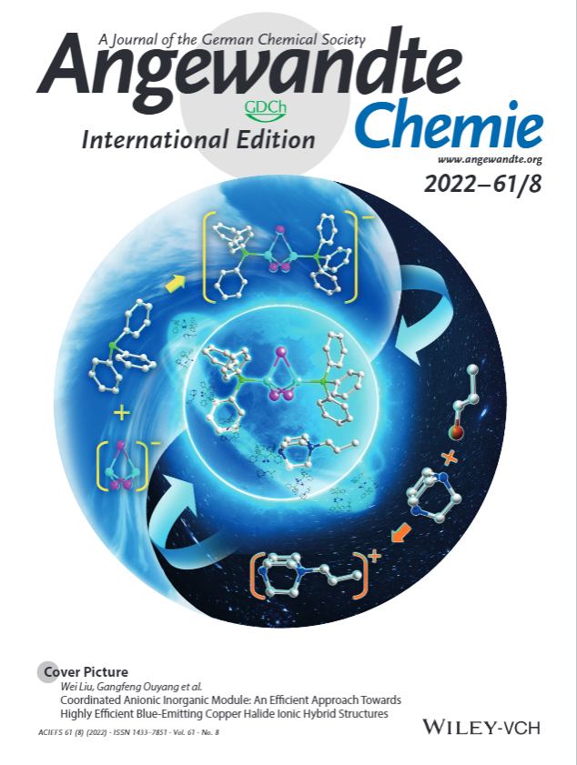 中大新聞網訊(通訊員劉威)近日,中山大學化學工程與技術學院歐陽鋼鋒教授、劉威副教授課題組在Angewandte Chemie International Edition發表題為“Coordinated Anionic Inorganic Module—An Efficient Approach Towards Highly Efficient Blue-Emitting Copper Halide Ionic Hybrid Structures”的研究論文,并被評為熱點論文(Hot Paper)和封面論文(Front Cover)。該工作提出了配位型離子團簇結構的策略,設計并得到離子鍵和共價鍵協同作用產生強藍光發射的系列化合物,為理解鹵化亞銅類雜化發光材料中結構與性能之間關系提供新思路,也為高效藍光發光材料的設計制備提供新途徑。
