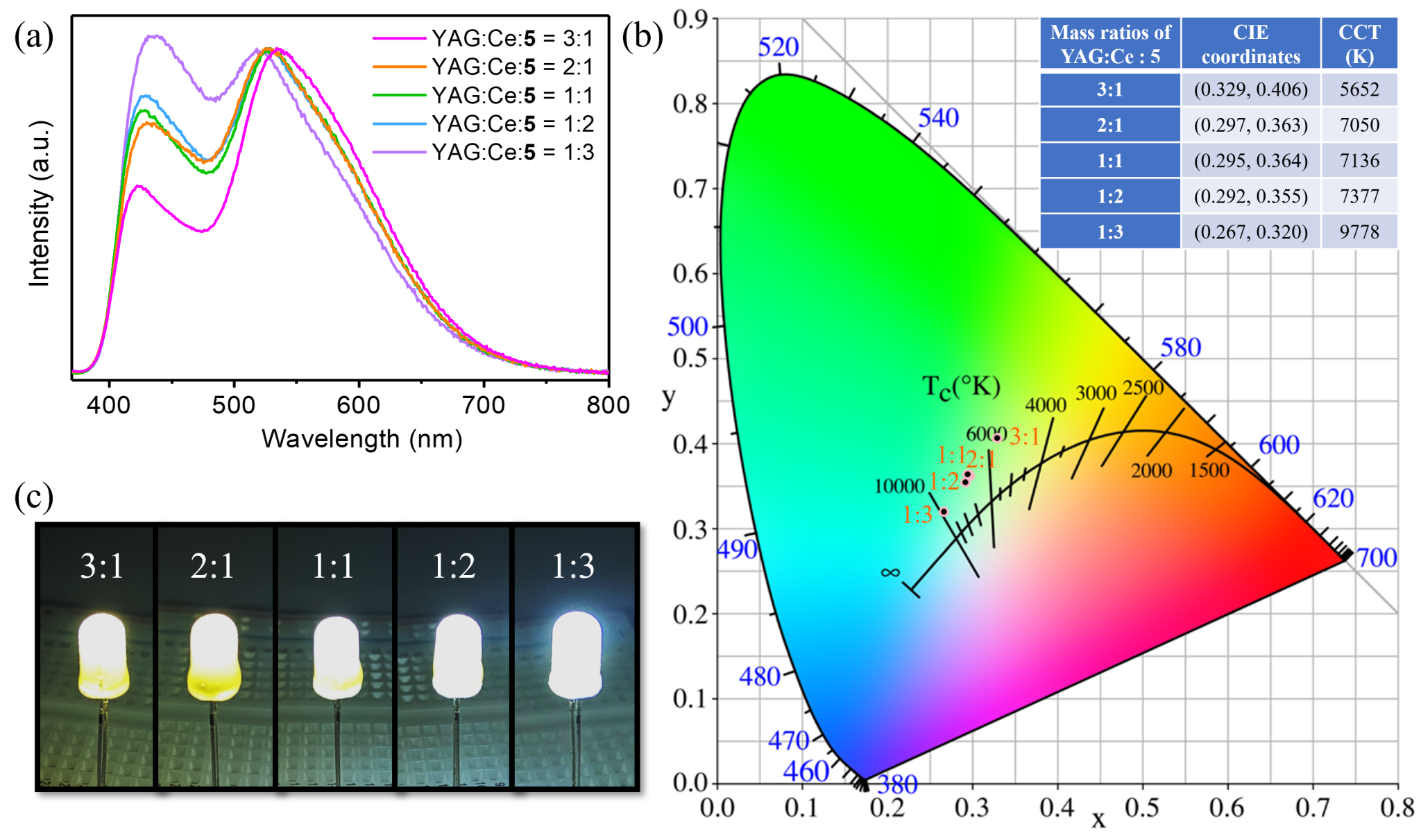 圖3不同混合比例的白光發光粉末的:(a) 熒光發射譜圖;(b) 色坐標圖以及色溫值;(c) 白光燈珠通電發光照片