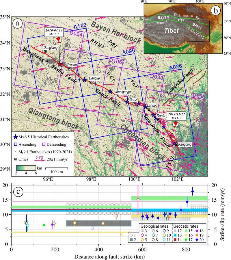中大新聞網訊(通訊員喬鑫、周宇)長約900公里的玉樹-甘孜-鮮水河斷裂帶(圖1)是全球地震活動最頻繁的斷裂帶之一,自1700年以來發生了至少12次7級以上的大地震。盡管前人對該斷裂帶的歷史地震破裂與滑動速率等開展了大量研究,但基于有限的野外考察點并不足以定量評價該斷裂帶的應變積累率和地震潛能。玉樹-甘孜-鮮水河斷裂帶作為巴顏喀拉塊體的南邊界,其運動學特征對于理解青藏高原東部的構造變形模式也具有至關重要的意義。前人研究表明,該斷裂帶西部的玉樹-甘孜斷層與東部的鮮水河斷層在地震活動性、滑動速率等方面均存在明顯差異,但其成因尚不清楚。