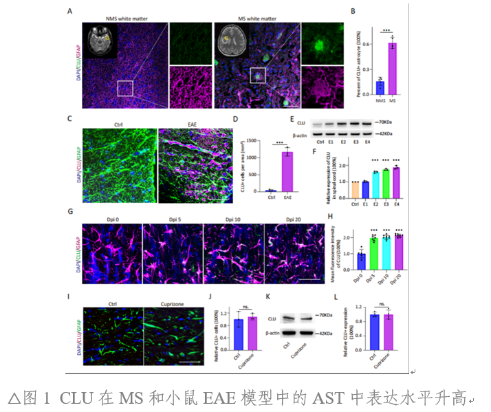 MS患者標本結合已公開發表的測序數據顯示,星形膠質細胞(AST)在活躍的病灶區域呈現顯著的Clusterin(CLU)高表達。另外,在EAE和LPC誘導的脫髓鞘模型病灶中,也觀察到AST細胞CLU表達上調。且EAE中CLU表達水平與EAE殘疾評分存在顯著相關。然而,在銅腙誘導的非炎癥脫髓鞘模型中,并未出現CLU表達上調。證明,CLU僅在“炎性”脫髓鞘環境中AST細胞的特異性上調(圖1、圖2)。