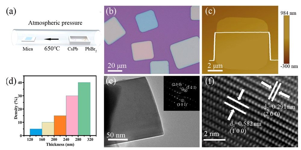 圖1. APCVD法所制備的CsPbBr3微米方片的形貌和晶格結構