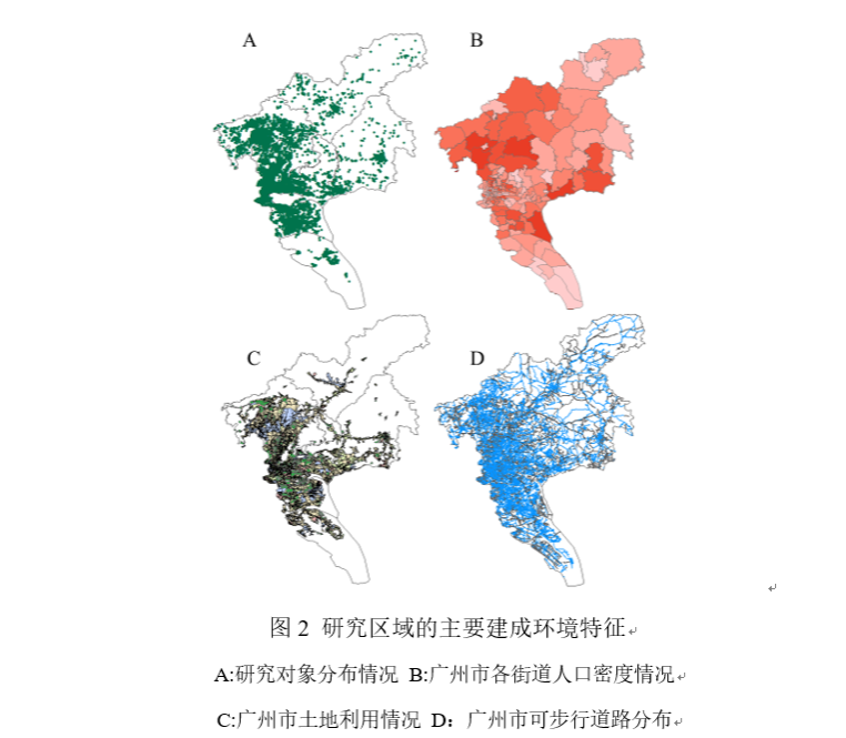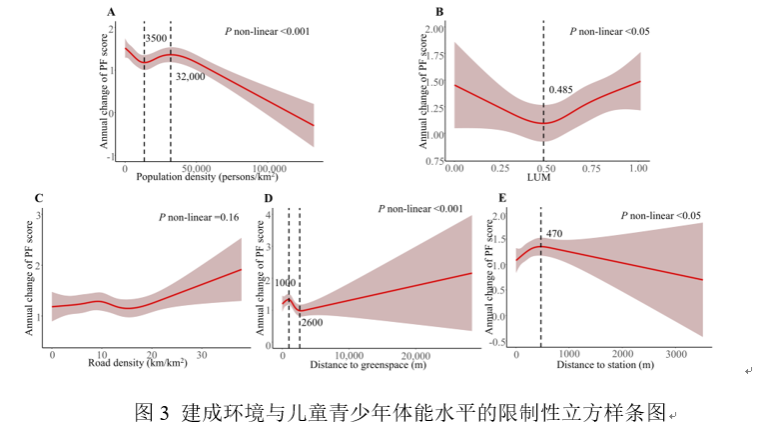 研究團隊利用COHERENCE項目(陳亞軍教授課題組在廣州地區的一項大規模前瞻性隊列研究)2016/17至2019/20學年的隊列數據,基于5Ds框架(Density, Diversity, Design, Destination accessibility, Distance to transit)獲取的居住地周邊建成環境數據,分析了96,402名兒童青少年的體質健康和人口統計信息。該研究采用了多層次的統計模型,考慮了學生、學校和行政區的層次結構,以準確評估建成環境對體質健康的影響。此外,研究還采用了限制性立方樣條(RCS)曲線來揭示建成環境與體質健康之間的非線性關系,并進行了閾值分析以確定不同建成環境特征對體質健康影響的臨界點。