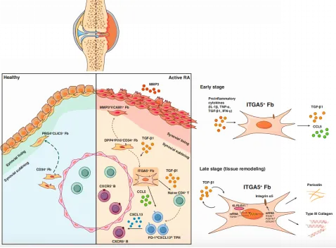 ITGA5+滑膜成纖維細胞在RA活動期患者及淋巴細胞浸潤型滑膜炎中上調,可能與RA的治療抵抗性相關。這一細胞亞群可能源自DPP4+PI16+CD34+成纖維細胞的分化。ITGA5+滑膜成纖維細胞可能在滑膜炎癥的早期階段出現,并通過分泌TGF-β1誘導幼稚CD4+ T細胞向CXCL13hi PD-1hi TPHs方向分化。關節腔內注射ITGA5+滑膜成纖維細胞會加重膠原誘導關節炎小鼠的滑膜炎癥和骨破壞。