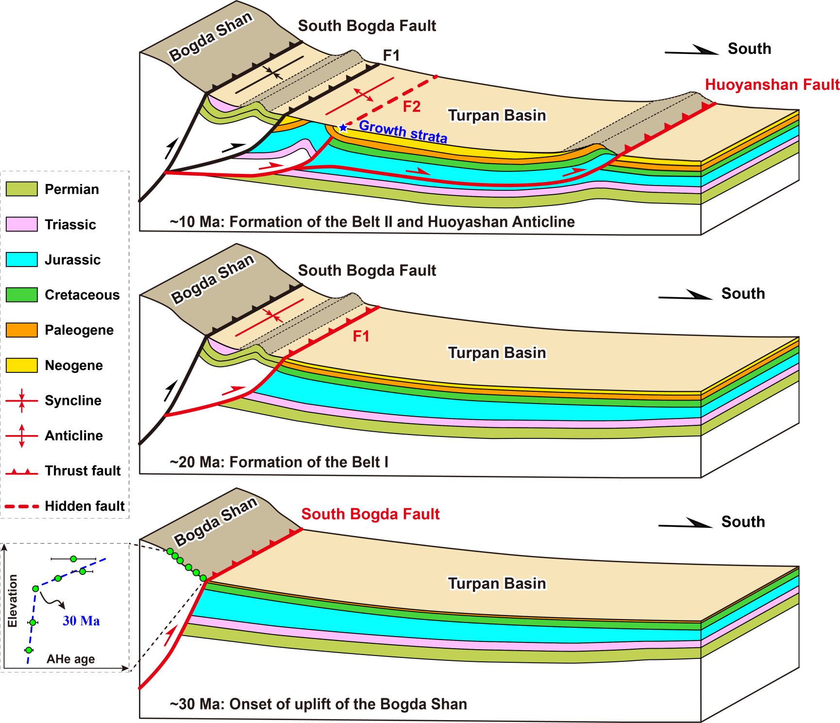 晚中新世(約10 Ma),博格達南緣斷層持續向吐魯番盆地擴展,形成第二排褶皺逆沖帶(Belt II),同時沿侏羅系底部滑脫并延伸約30公里至盆地內部,導致侏羅系至新生代連續地層的出露和褶皺變形,形成第三排褶皺逆沖帶(中央褶皺逆沖帶)。