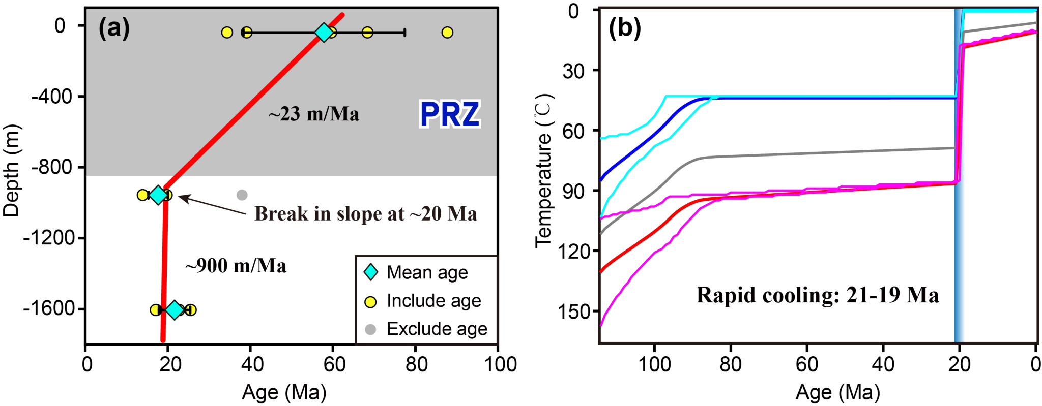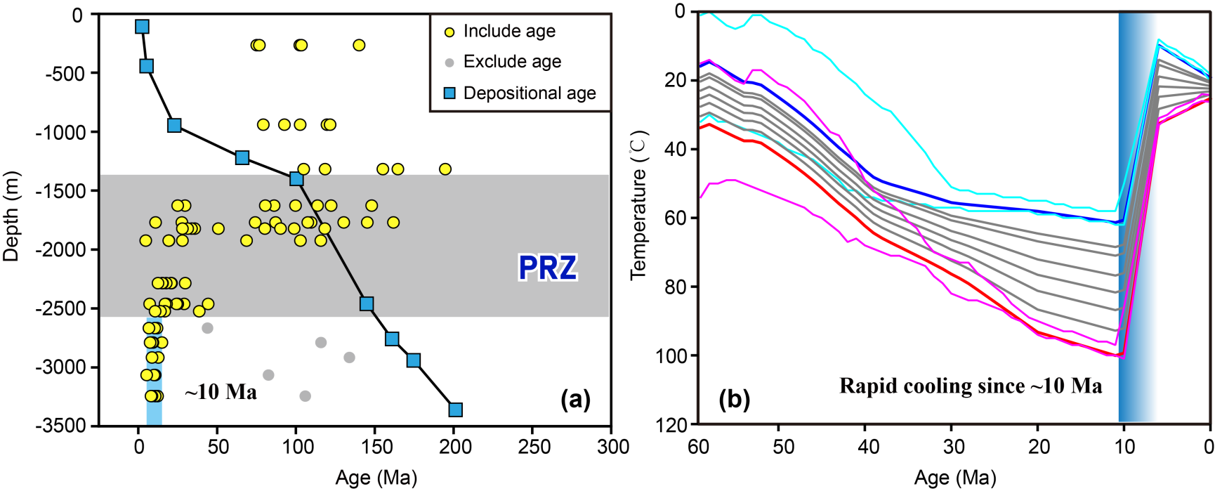 (1) AHe年齡-深度關系和熱歷史模擬結果表明,Belt I自約20 Ma開始快速剝露(圖2);
