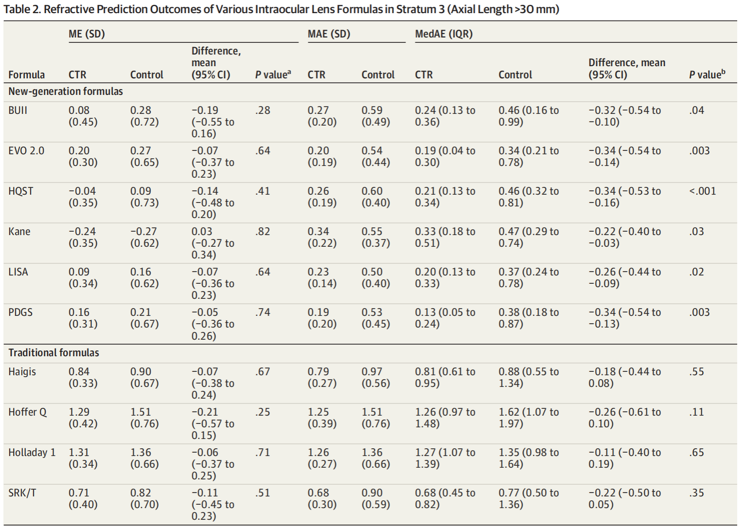 近日,羅莉霞教授團隊在JAMA Ophthalmology上發表RCT研究的二次分析成果。研究采用按AL分層隨機對照的設計,將患者分為26mm≤AL<28mm、28mm≤AL<30mm以及AL≥30mm三層,每層隨機分配至對照組(不植入CTR)或試驗組(植入CTR),并在二次分析中進一步排除了最佳矯正視力<20/40和散光大于3.0D的患者。結果顯示,高度近視眼植入CTR不會引起屈光漂移,無需額外調整目標屈光度設計,并顯著提升AL≥30mm患者在新一代IOL屈光力計算公式中的預測準確性。