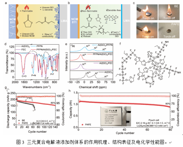 為了進一步提升鋰金屬電池的能量密度和安全性,團隊利用分子結構工程策略,構建三元復合電解液添加劑體系:通過Al(EtO)3與氟代碳酸乙烯酯和乙氧基五氟環三磷腈分子的協同配位,在電極表面原位聚合形成均勻的固態電解質界面,同步緩解三元正極晶格應力并抑制負極枝晶,提升了鋰金屬電池在4.7 V電壓下的循環穩定性和安全性(圖3)。該突破性進展發表于2025年5月10日《國家科學評論》。