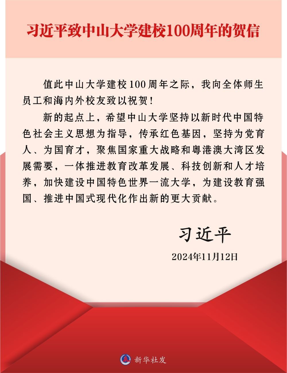 新華社廣州11月12日電?中共中央總書記、國家主席、中央軍委主席習近平11月12日致信祝賀中山大學建校100周年,向全體師生員工和海內外校友致以祝賀。習近平在賀信中強調,新的起點上,希望中山大學堅持以新時代中國特色社會主義思想為指導,傳承紅色基因,堅持為黨育人、為國育才,聚焦國家重大戰略和粵港澳大灣區發展需要,一體推進教育改革發展、科技創新和人才培養,加快建設中國特色世界一流大學,為建設教育強國、推進中國...