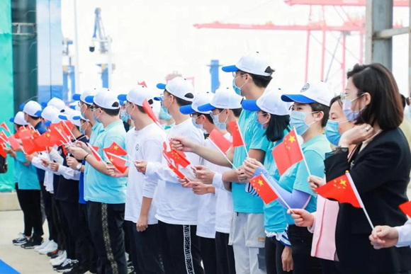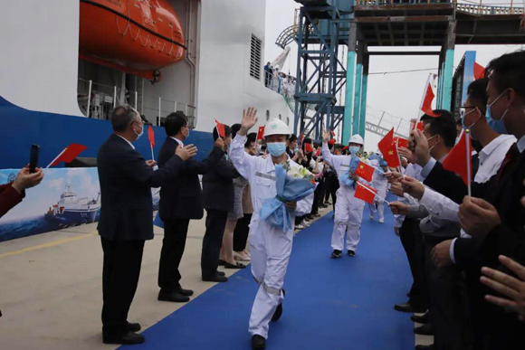 在中山大學校歌聲中,科考船建設指揮部全體人員、全體船員走下舷梯,下船列隊,中山大學校領導熱烈歡迎,學生獻花,現場人員起立鼓掌。