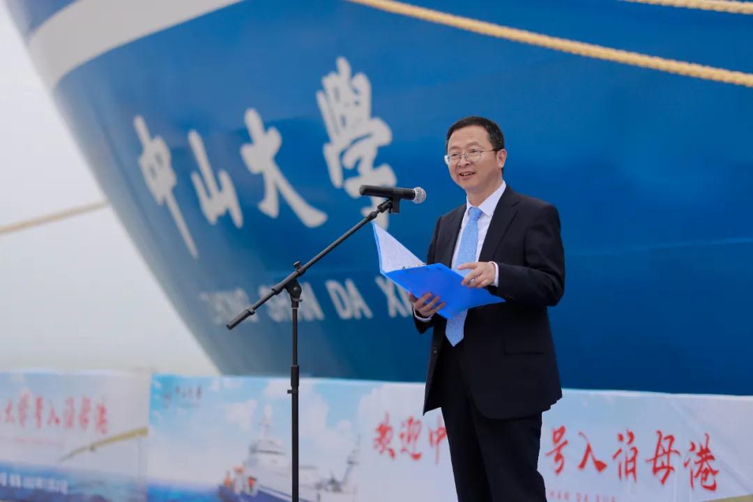 為了迎接“孩子”回家,下午3時,中山大學在碼頭舉行了簡潔而莊重的入泊母港歡迎儀式。活動由中山大學副校長蘭平主持,中山大學黨委書記陳春聲,中科院院士、中山大學校長高松,珠海市金灣區委書記梁耀斌,涉海學院師生代表,相關職能部門負責人、工作人員出席。