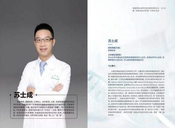 蘇士成,男,漢族,生于1983年5月,中共黨員、醫(yī)學(xué)博士,副主任醫(yī)師、研究員,博士生導(dǎo)師。現(xiàn)任中山大學(xué)孫逸仙紀(jì)念醫(yī)院乳腺腫瘤中心副主任、樹華乳腺癌研究中心主任,兼任中國抗癌協(xié)會青年理事、中國抗癌協(xié)會腫瘤轉(zhuǎn)移專業(yè)委員會委員、廣東抗癌協(xié)會乳腺癌專業(yè)委員會委員、歐洲免疫治療協(xié)會會員等。