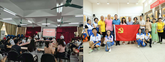左圖:“薪火相傳守初心”老中青三代共學黨史活動 右圖:在職黨員陪同黃起鵬教授前往茂名高州市團結學校捐書送愛心(來源:離退休工作處)