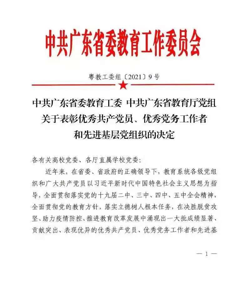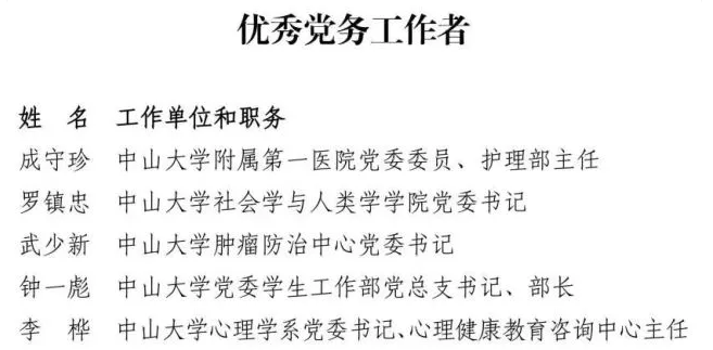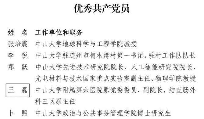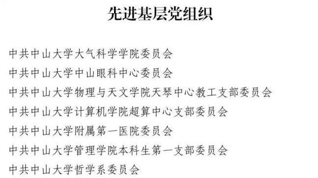 據了解,為慶祝中國共產黨成立100周年,中共廣東省委教育工委、中共廣東省教育廳黨組表彰了一批優秀共產黨員、優秀黨務工作者和先進基層黨組織。其中,我校黨委有5人被授予“優秀共產黨員”稱號,分別是張培震、李銳、鄭躍、王磊和卜熙;5人被授予“優秀黨務工作者”稱號,分別是成守珍、羅鎮忠、武少新、鐘一彪和李樺;7個黨組織被授予“先進基層黨組織”稱號,分別是中共中山大學大氣科學學院委員會、中共中山大學眼科中心委員會、中共中山大學物理與天文學院天琴中心教工支部委員會、中共中山大學計算機學院超算中心支部委員會、中共中山大學附屬第一醫院委員會、中共中山大學管理學院本科生第一支部委員會和中共中山大學哲學系委員會。
