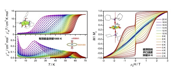 單分子磁體有效能壘突破1000K(左下)、單分子磁體磁滯回線開口溫度突破20K(右下)(來源:化學(xué)學(xué)院)