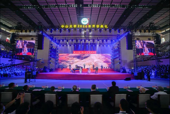 中大新聞網廣州9月12日電(記者趙現廷)9月12日,我校2020年開學典禮暨“開學第一課”在南校園新體育館舉行,來自三校區五校園的近8000名新生齊聚一堂,共上 “開學第一課”。教育部黨組派駐我校的黨建工作聯絡員彭新一,校黨委書記陳春聲、校長羅俊,中國工程院院士林浩然,中國科學院院士計亮年、陳小明、高銳、宋爾衛、戴永久,在校全體校領導及校長助理,以及各學院、直屬系、附屬醫院負責人等出席開學典禮。