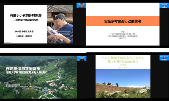 此次活動邀請了中國農(nóng)業(yè)大學(xué)李小云教授主講“有益于小農(nóng)的鄉(xiāng)村旅游實(shí)踐”,中山大學(xué)李郇教授主講“實(shí)施鄉(xiāng)村建設(shè)行動的思考”,“高校非遺(文創(chuàng))幫扶聯(lián)盟”代表湖南大學(xué)盧健松教授主講“在地建造與共同富?!?,中山大學(xué)吳重慶教授主講“小農(nóng)戶視角下的常態(tài)化扶貧與實(shí)施鄉(xiāng)村振興戰(zhàn)略的銜接”。四位專家的報(bào)告既有政策解讀,也有實(shí)踐分享,理論深刻、貼合實(shí)際、指導(dǎo)性強(qiáng),讓人深受啟發(fā)。聯(lián)盟專家委員會主任、中山大學(xué)保繼剛教授主持報(bào)告環(huán)節(jié),并與其他專家一同交流探討了在鄉(xiāng)村旅游幫扶實(shí)踐中大家關(guān)注的一些熱點(diǎn)難點(diǎn)問題。