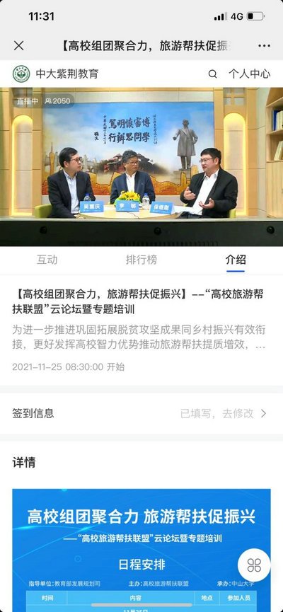 中大新聞網(wǎng)12月2日廣州電(通訊員梁一川、林煒雙)近日,由教育部發(fā)展規(guī)劃司指導(dǎo),“高校旅游幫扶聯(lián)盟”主辦,聯(lián)盟理事長高校中山大學(xué)承辦的“高校旅游幫扶聯(lián)盟”云論壇暨專題培訓(xùn)在線上順利舉行。本次論壇旨在深入學(xué)習(xí)貫徹習(xí)近平總書記關(guān)于教育、扶貧工作、“三農(nóng)”工作的重要論述和黨的十九屆六中全會精神,進(jìn)一步推進(jìn)落實(shí)鞏固拓展脫貧攻堅(jiān)成果同鄉(xiāng)村振興有效銜接,充分發(fā)揮高校智力資源優(yōu)勢,推動高校組團(tuán)式旅游幫扶高質(zhì)量發(fā)展。