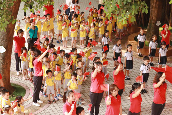 操場(chǎng)中央的樓廊上,是幼兒園儀仗隊(duì)的展旗。五星紅旗迎風(fēng)飄揚(yáng),老師們、家長(zhǎng)和孩子們紛紛加入,揮舞著手中的小紅旗,跟隨音樂(lè)一起高聲歌唱,在幼兒園里匯聚出了一道最美風(fēng)景線。