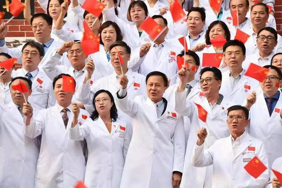 在中山大學(xué)醫(yī)學(xué)部紅樓門(mén)前,一場(chǎng)《歌唱祖國(guó)》大合唱正在舉行。院領(lǐng)導(dǎo)與近百位各??浦魅巍⒔淌诘葥]舞著手中的國(guó)旗,嘹亮有力的歌聲響徹整個(gè)校園。