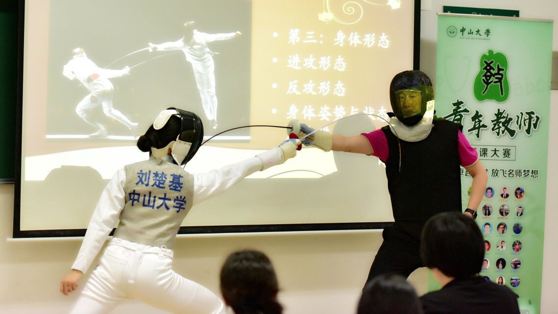 教工第二黨支部黨員、深受學生喜愛的擊劍教練員王磊老師在我校青年教師授課大賽上展示課堂風采