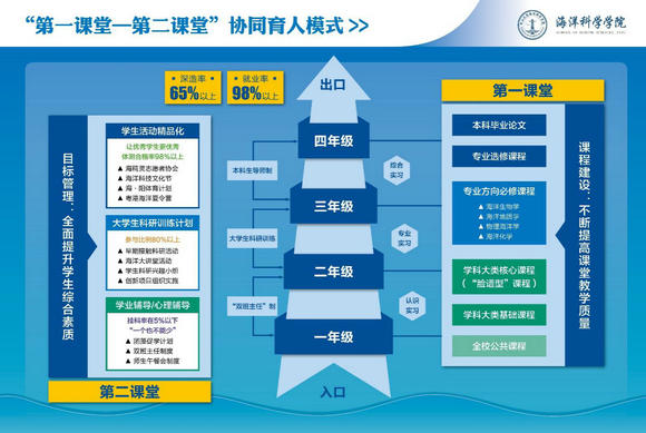 我們的辦學特色主要在于兩個方面:一是“學科大類—專業方向—綜合提升”課程體系;二是“第一課堂—第二課堂”協同育人機制。經過八年多時間的建設與發展,我們已建成了海洋科學廣東省高校實驗教學示范中心(2014),海洋科學專業被批準為國家級專業綜合改革試點(2014)、廣東省戰略性新興產業特色專業建設點(2015)、廣東省重點專業(2016)和中山大學首批8個品牌專業建設點之一(2016)。