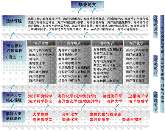 在二年級秋季學期結束時按海洋生物、海洋地質、物理海洋、海洋化學“四選一”分流培養,學生通過專業方向必修課程學習,系統掌握各方向基本研究原理和方法,為專業綜合提升建立基礎。