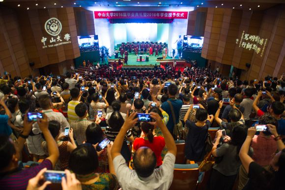 6月22日,伴著“白云山高,珠江水長”的旋律,主禮教授隊伍在中山大學權杖的引領下緩緩邁入梁銶琚堂,拉開了2016屆畢業典禮暨2016年學位授予儀式的序幕。在未來四天的時間里,全校14000多名畢業生將一一登上主禮臺,握手、行禮,接受大學校長頒授學位,帶著師長們溫暖的祝福,親友們殷殷的期許,從康樂園整裝啟航。