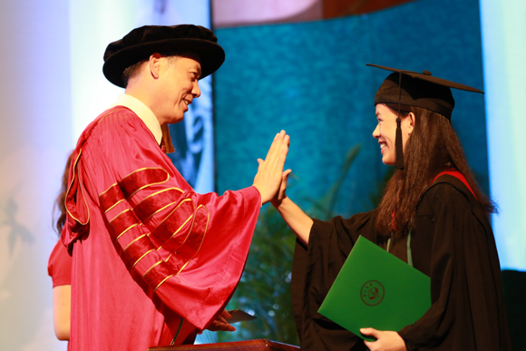 中國語言文學系畢業生李延欣是今年全校第一位登上主禮臺與校長握手的學生,也是第一位佩戴著優秀畢業生榮譽綬帶上臺的學生,“綬帶是學校給我的榮譽和表彰,也是學校對我四年付出的肯定。”下臺后,李延欣仍按捺不住激動:“校長很親切,還跟我說祝賀畢業。”