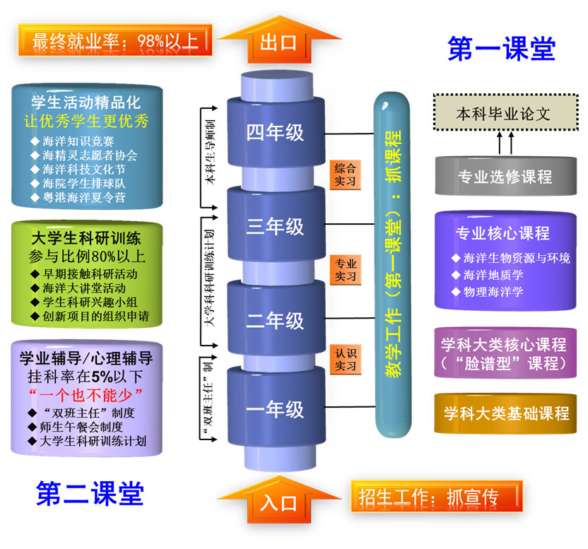 在協(xié)同管方面,基于第一和第二兩大課堂相對(duì)脫節(jié)、跨校區(qū)辦學(xué)等現(xiàn)實(shí)情況,海洋學(xué)院實(shí)施本科生事務(wù)委員會(huì)、本科生導(dǎo)師、雙班主任、師生午餐會(huì)、海洋大講堂等制度,全面推進(jìn)大學(xué)生創(chuàng)新科研訓(xùn)練計(jì)劃和學(xué)生活動(dòng)的精品化,將專業(yè)教師、輔導(dǎo)員、實(shí)驗(yàn)技術(shù)人員、教學(xué)管理人員和學(xué)生有機(jī)聯(lián)系在一起。通過本科生事務(wù)委員會(huì)聽課、師德考核小組聽課、院領(lǐng)導(dǎo)聽課與巡考、學(xué)生評(píng)教等途徑,構(gòu)建課程質(zhì)量反饋控制體系,面向一、二、三年級(jí)所有專業(yè)課程全覆蓋,實(shí)現(xiàn)對(duì)完美教學(xué)質(zhì)量的不斷追求。在學(xué)業(yè)輔導(dǎo)、就業(yè)指導(dǎo)、大學(xué)生科研訓(xùn)練計(jì)劃等方面構(gòu)建立體化目標(biāo)體系,每年分別發(fā)布2次本科生學(xué)業(yè)情況分析報(bào)告、科研訓(xùn)練分析報(bào)告和就業(yè)質(zhì)量報(bào)告,實(shí)現(xiàn)目標(biāo)管理,從而形成協(xié)同管理平臺(tái)。