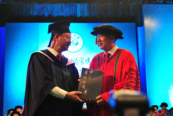 今年的畢業典禮主禮臺上,有一位特別的來賓。中山大學顧問董事會名譽主席、中山大學名譽博士、嶺南學院董事會名譽主席、香港美心集團名譽主席伍沾德先生,受羅俊校長邀請參加學校的畢業典禮。已經90多歲高齡的伍沾德先生,堅持坐在主禮教授席,見證嶺南學院每一位學子畢業的神圣時刻。