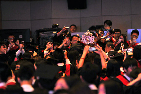 歷史學系碩士生賀婧慧在跟校長握手時學位帽不慎滑落,她尷尬地撿起來,一時間手足無措。沒想到校長接過帽子幫她戴好,臺下一片羨慕的掌聲。賀婧慧下臺后仍然激動,聲音都有點顫抖:“也許沒有這樣一個‘事故’,我就無法享受這種親密。校長之前肯定特別累了,我還無意中出了紕漏,雖然很抱歉,但更是感謝校長。”