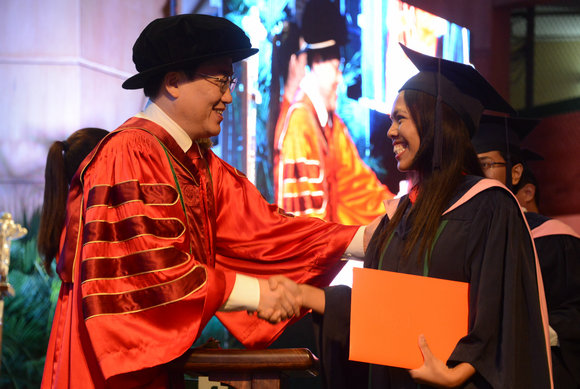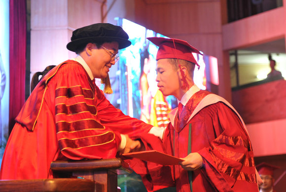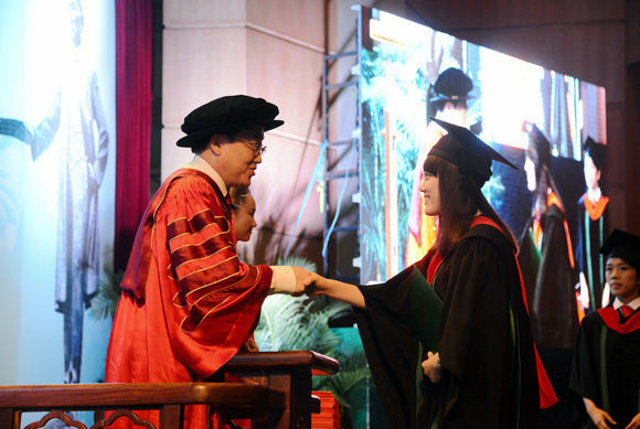 徐曉雯是中國語言文學系優秀本科畢業生,也是今年全校第一位登上主禮臺與校長握手的學生。在握手時,曉雯和校長有一段簡短的交談: