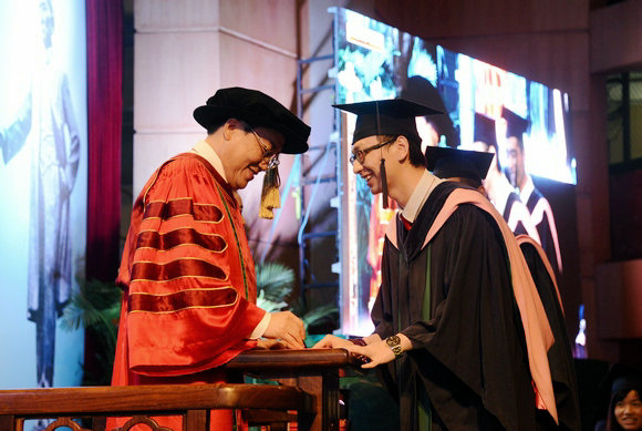 作為第一個要到校長簽名的畢業生,社會科學與人類學學院的碩士畢業生郭中飛無疑成了全場的焦點。“我要把這個簽名裱起來,這是校長給我的親筆簽名!”郭中飛激動地說道,“很多同學說在中大幾年,只有在畢業的這一天才能見到校長。但作為中大黨委宣傳部的攝影記者,我幾乎參加過學校所有的大型活動,見到校長的機會也就更多。所以今年畢業,我就想一定要請校長幫我簽個名!”盡管今年才畢業,但作為一名攝影記者,兩年來他已經見證了二十多場畢業典禮了。“臺上和臺下是完全兩種感覺,”郭中飛感慨道,“自己站上臺才真正感覺到儀式的莊嚴和神圣,我非常激動。”