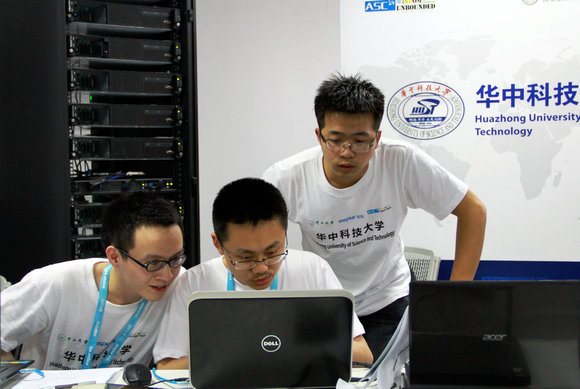 華中科技大學參賽隊在ASC13成績驕人,今年能否再創佳績備受矚目。隊員何斌表示,今年的參賽隊伍大部分來自學校的“聯創團隊”。聯創團隊創建于2000年6月,參加了國內外許多高水平的IT領域競賽,成績優秀。在Imagine Cup微軟“創新杯”學生大賽中,該團隊連續5年闖進總決賽,兩次獲得IT方向的全球總冠軍。去年,以聯創團隊為主力的華中科技大學參賽隊伍在ASC13中獲MIC應用優化單項獎,總成績排名第三,并代表中國參加國際大學生超級計算機競賽決賽(ISC),獲Linpack最高性能獎,刷新世界紀錄。今年比賽隊伍中也有2名去年參加了ASC的團隊成員,經驗豐富。在接待組志愿者的眼中,他們“很有趣,還會在緊張的準備過程中相互開玩笑”。