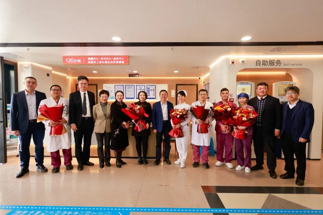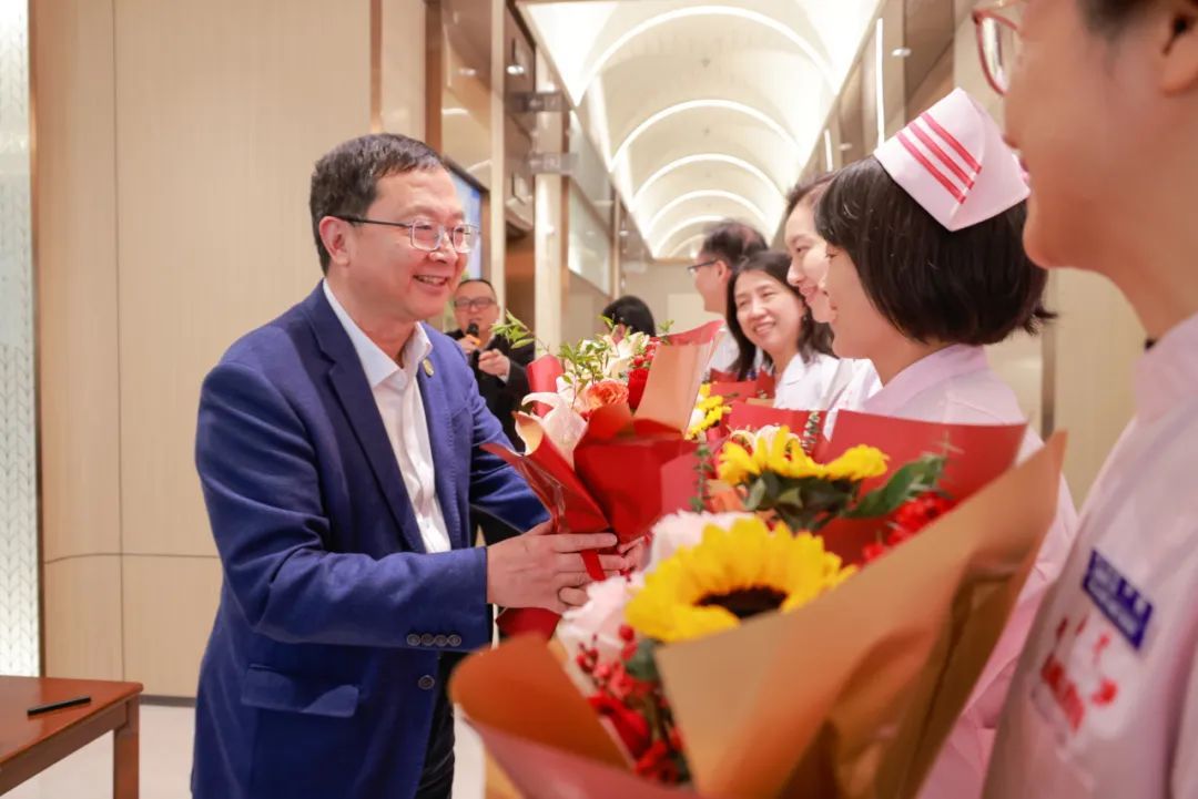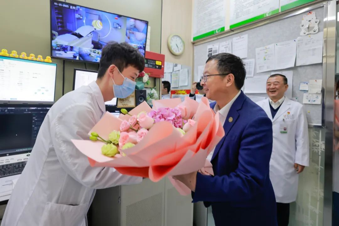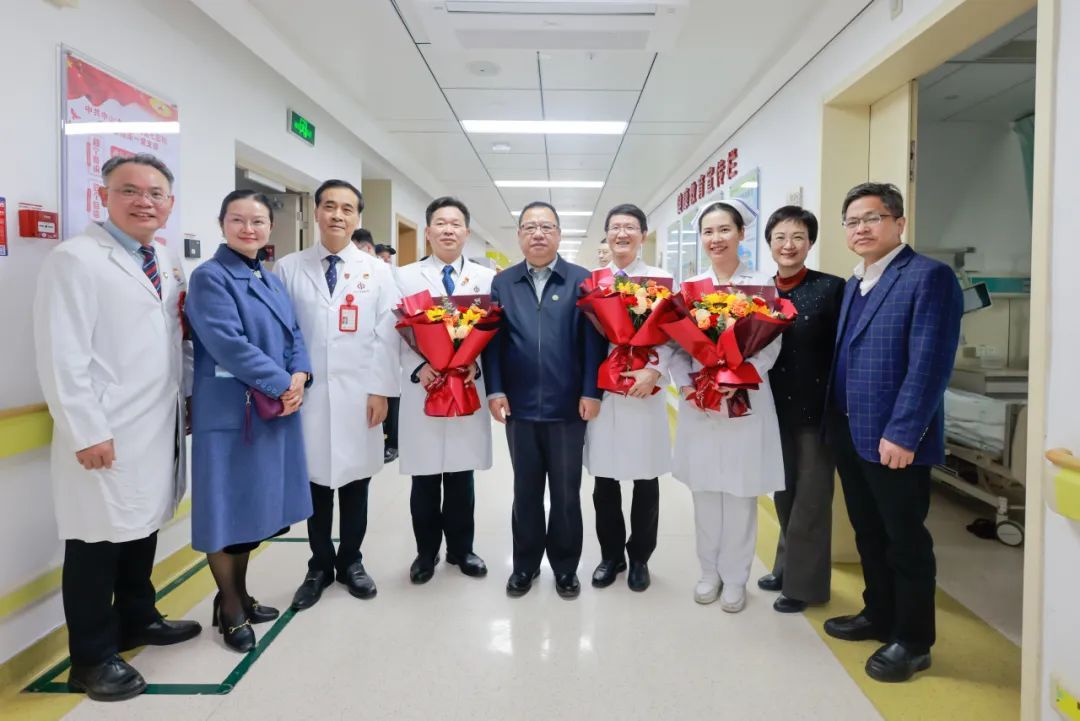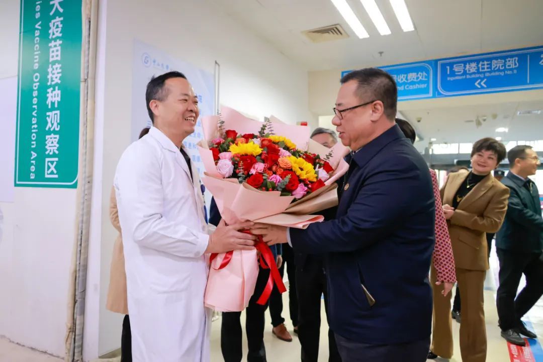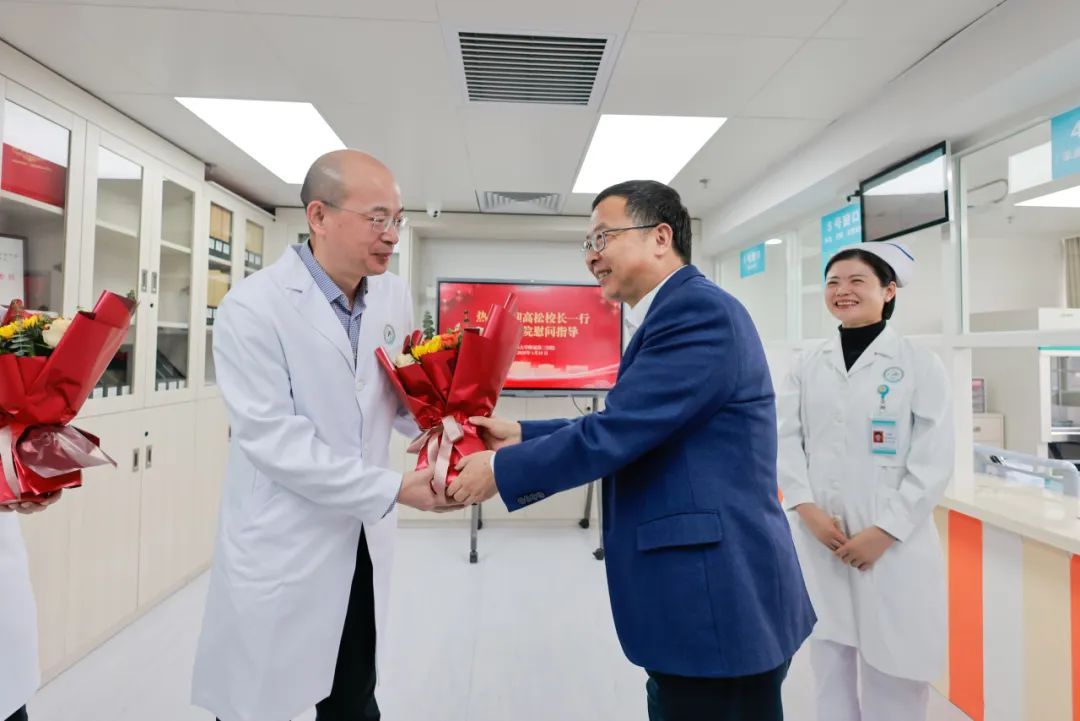 在附屬第一醫院,朱孔軍書記走訪了腎內科、醫學檢驗科、器官移植中心等,并向醫務人員送上獻花。朱孔軍書記表示,過去一年醫院取得了重大成就,感謝全體醫務人員為人民健康事業、為學校發展、為百年校慶作出的重要貢獻。新的一年,希望醫院面向國家重大戰略和粵港澳大灣區發展需求,加快創建國家醫學中心,推動醫院高質量發展邁上新臺階。