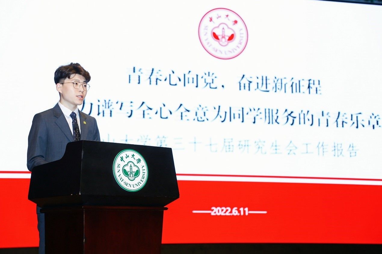 與會代表聽取并審議中山大學(xué)第三十七屆研究生會劉宗宇所作的工作報告——《青春心向黨,奮進新征程,全力譜寫全心全意為同學(xué)服務(wù)的青春樂章》。報告圍繞“強化思想引領(lǐng),堅定理想信念”“深化改革創(chuàng)新,突出聯(lián)系服務(wù)”“聚焦服務(wù)同學(xué),做好就業(yè)服務(wù)”“賦能同學(xué)成長、促進全面發(fā)展”四個方面進行全面總結(jié),并對未來工作進行展望。