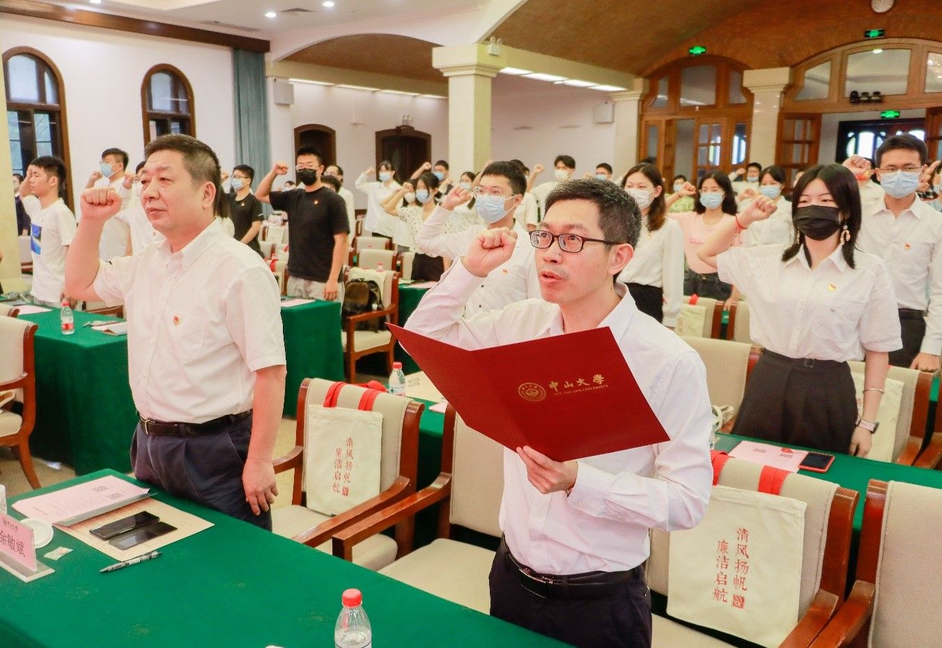余敏斌副書記、邰忠智副校長、漆小萍主任分別向現場參加活動的學生代表頒發了廉潔紀念章,并代表學校宣讀了《致中山大學2022屆畢業生廉潔倡議書》。黨委學生工作部部長鐘一彪等分別帶領三校區現場參會的畢業生黨員重溫入黨誓詞。
