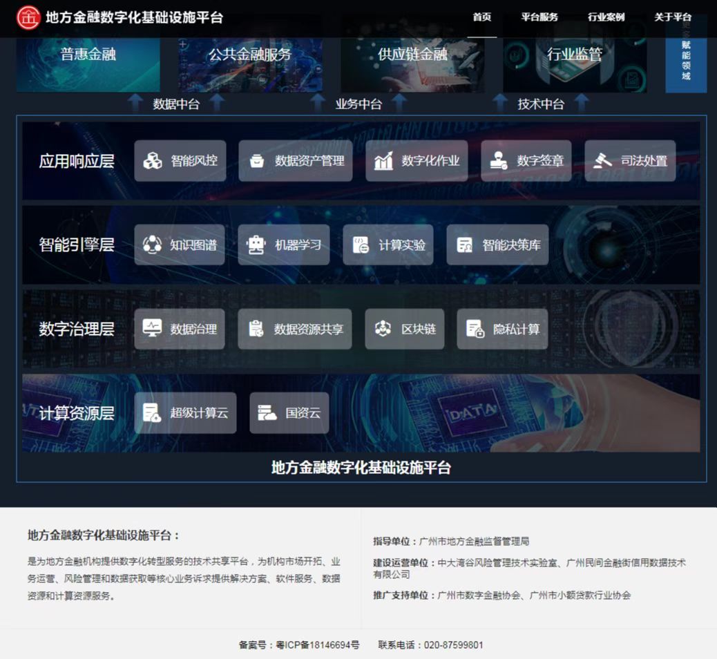 “一室”的首個重大產學研項目是研發全國首個地方金融數字化基礎設施平臺(“一臺”),該平臺由廣州市地方金融監督管理局指導建設,集成中山大學大數據管理行為與決策(教育部首批哲學社會科學實驗室)的研究力量和國家超級計算廣州中心強大算力資源,匯聚國內多家高校與科研機構及省內頭部金融科技企業的研發力量,為銀行、保險、小額貸款、融資租賃和融資擔保等多類金融機構提供數字化解決方案、數據資源、算力支持及系統服務集成、跨行業互動協作的基礎性技術服務平臺和開放式創新生態,是廣州依托數字金融提升粵港澳大灣區的金融發展能級的創新舉措。