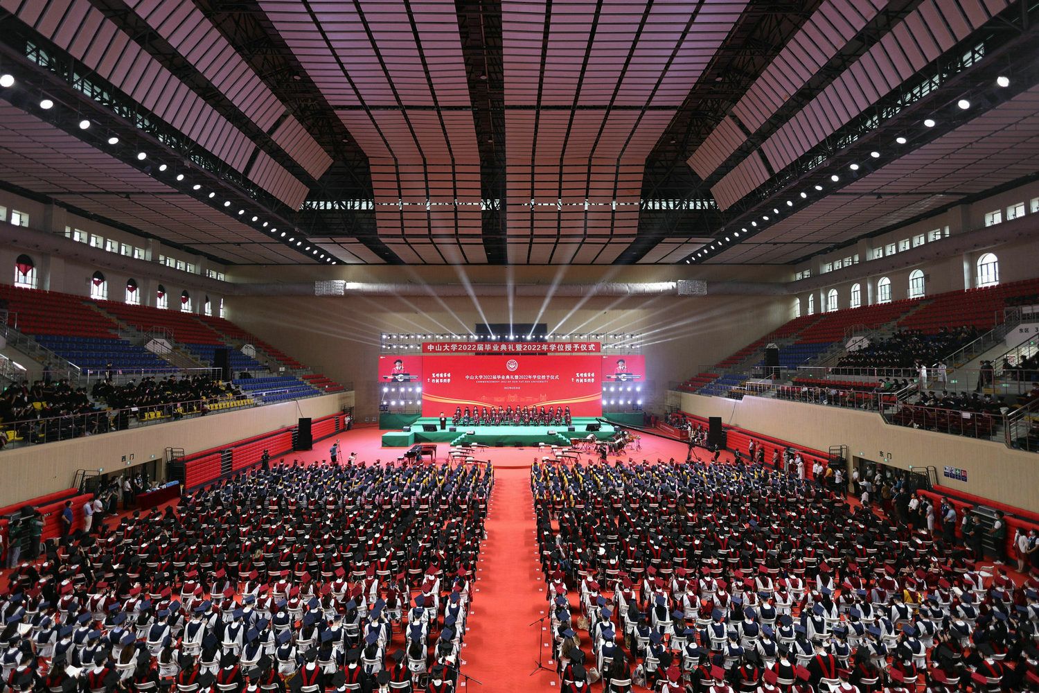 中大新聞網廣州6月29日電(記者邱清萌、彭心如、李建平)“小軒窗,大學堂,再回首綠瓦紅墻。”6月28日上午,中山大學2022屆畢業典禮暨2022年學位授予儀式在廣州校區南校園新體育館隆重舉行。來自中大三校區五校園的近3000名本科、碩士、博士學生代表齊聚一堂,中山大學黨委書記陳春聲,中國科學院院士、校長高松,中國科學院院士陳小明、張培震、戴永久,校學位評定委員會委員等出席典禮。典禮全程網絡直播,萬名畢業生在師長的祝福中奔向祖國各地。