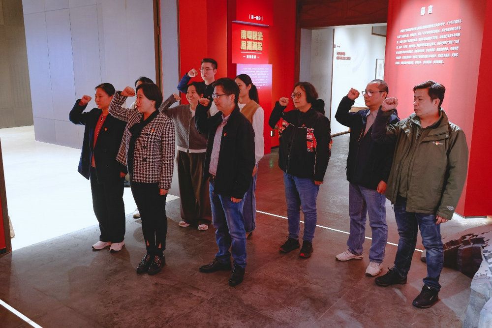 參觀中,同志們不時駐足,仔細觀看,并針對展陳所涉及的中大紅色校史及其他關心的內容咨詢講解員具體情況,互相討論展品背后蘊含的歷史故事,感悟中華文化的博大精深、中華文脈的源遠流長以及中華文明的生生不息。在紅色廣東專題版本展廳,在鮮紅的黨旗下,黃艷書記還帶領大家重溫入黨誓詞,回顧入黨初心。