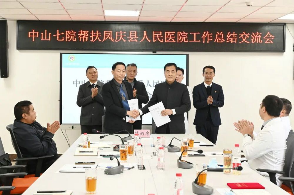 中山七院幫扶鳳慶縣人民醫院工作總結交流會于1月9日上午召開。會上,中山七院與鳳慶縣人民醫院第3次簽署三年幫扶協議,中山七院副院長張常華繼續受聘為鳳慶縣人民醫院掛職院長。鳳慶縣人民政府副縣長郭瑞、鳳慶縣衛生健康局局長雷樹春、鳳慶縣人民醫院全體院領導及中山七院幫扶醫療隊全體成員參加會議。