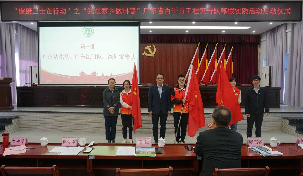 接下來,參會領導嘉賓為各突擊隊授旗。據介紹,今年寒假公共衛生學院共派出15支隊伍奔赴12個城市開展“我在家鄉做科普”廣東省百千萬工程突擊隊寒假社會實踐活動,足跡將遍布廣東省大灣區和粵東西北城鎮,還包括西藏拉薩、河南周口、江蘇鹽城、湖南邵陽等地。中大公衛學子將繼續帶著專業知識和滿腔熱情奔赴各地,用實際行動踐行“預防為主”的理念,傳遞健康知識,倡導健康生活方式,為我國的衛生與健康事業、為“百縣千鎮萬村”高質量發展貢獻青春力量。