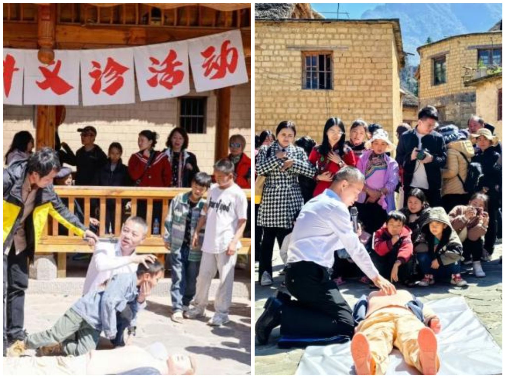 午后,劉江輝副教授面向村民和游客上了一堂生動(dòng)的急救培訓(xùn)課。“這樣雙手交叉,用力按壓,知道要按照什么節(jié)奏按壓?jiǎn)幔俊蹲铎琶褡屣L(fēng)》!”他的一番話逗樂了在場(chǎng)的村民。他解釋道,一分鐘按壓100到120次最合適,《最炫民族風(fēng)》的節(jié)奏是一分鐘114下。
