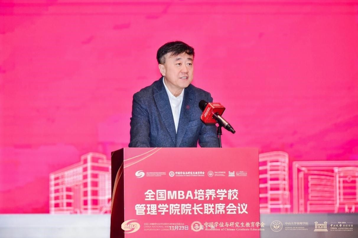 中山大學(xué)黨委副書記王帆致辭,他結(jié)合習(xí)近平總書記致中山大學(xué)建校100周年賀信精神,深刻總結(jié)了MBA教育未來發(fā)展的四個(gè)重要方向。他強(qiáng)調(diào),MBA教育要傳承紅色基因,培養(yǎng)具有堅(jiān)定理想信念和高度社會責(zé)任感的商業(yè)領(lǐng)袖;要為黨育人、為國育才,培育具備企業(yè)家精神的畢業(yè)生;要服務(wù)國家重大戰(zhàn)略和地方經(jīng)濟(jì)發(fā)展;要推進(jìn)教育改革,助力專業(yè)學(xué)位教育創(chuàng)新發(fā)展。