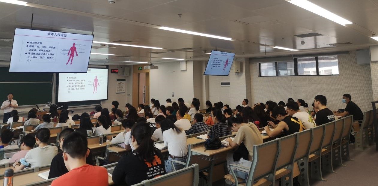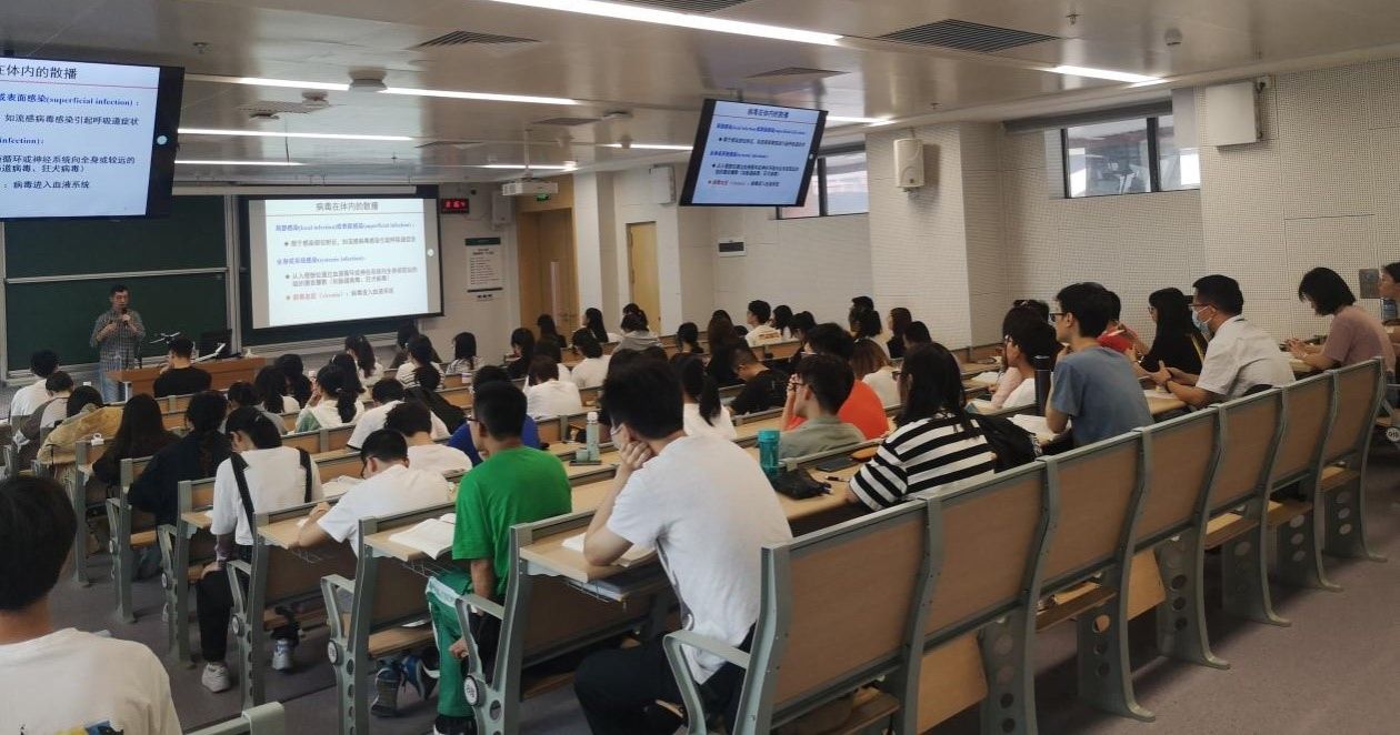 隨著課堂鈴聲響起,課程正式開始。《醫學免疫學》授課老師醫學院陶鑫副教授播放了歌曲《山高水長》,將學生的學習激情點燃。學生們自發起立熱烈鼓掌致謝,并歡迎陶老師開啟久違的線下教學。《醫學微生物學》課程同時段兩個教學班分別有兩位授課老師,郭德銀教授以多年豐富的教學經驗,充分調動了同學們學習的積極性和對學術的渴求;另一位授課老師施莽教授以生動的案例闡述人類健康和微生物特別是病毒的關系,牢牢抓住了學生們求知的心。