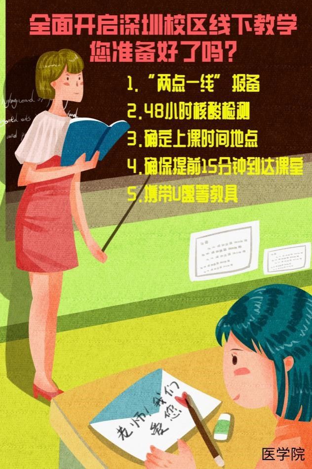 據悉,為了嚴格落實學校關于深圳校區全面啟動線下授課的通知精神,醫學院于5月7日晚專門召開全面恢復線下教學工作緊急會議,要求所有老師全面恢復線下授課,明確線上授課只針對未返校學生。5月8日上午,醫學院召開了學院教學督導線上會議,對相關工作進行了周密部署,并提出嚴格要求。為了給進入深圳校區授課的老師提供清晰指引,醫學院湯地副院長還精心制作了線下授課宣傳海報。