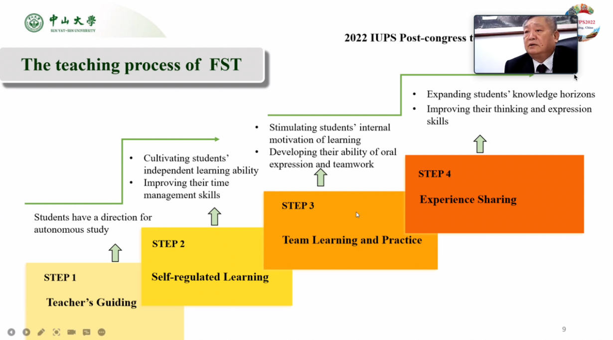 接著,為更好地向全球生理學者展示如何在線上進行基于生理學的“激越四段式”教學,中山醫學院生理學教研室副主任談智副教授帶領團隊成員進行教學法STEP1-STEP4的演示。中山大學附屬第一醫院心內科楊達雅副教授授針對學生小組分享進行提問及點評,精彩紛呈,獲得了國內外生理學同行的認可及贊許。