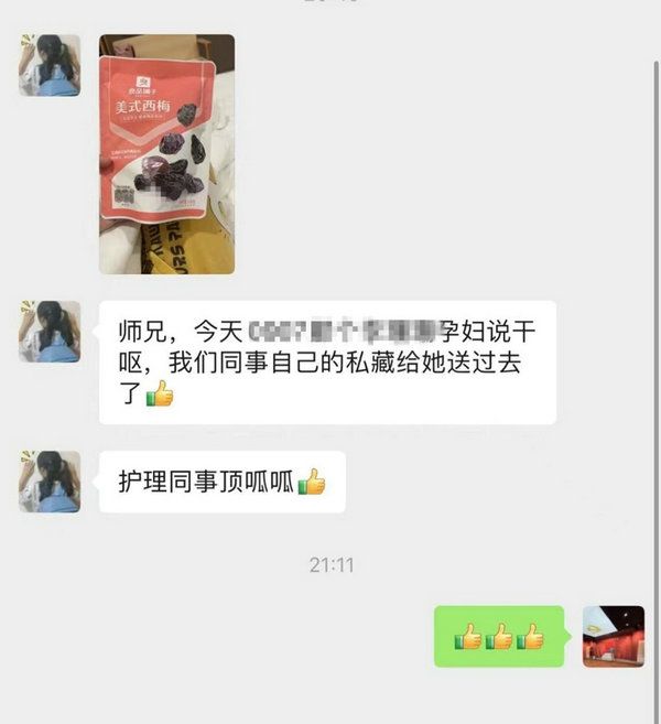護理部護士宋理送西梅微信工作群截圖(來源:附屬第三醫院)