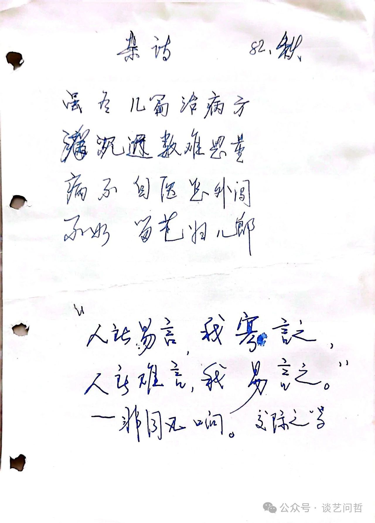 在嚴酷的生活現實面前,父親往往選擇“隱忍”,這不是對人生的妥協,而是一種積極的策略調整。父親經常抄錄《孟子·盡心上》的一段名言,所謂“窮則獨善其身,達則兼善天下”,這正是父親持守的人生信條。1980年代初,父親教學業績突出而遭遇工作中的某些“不公”,因作五言《答勸事》云: